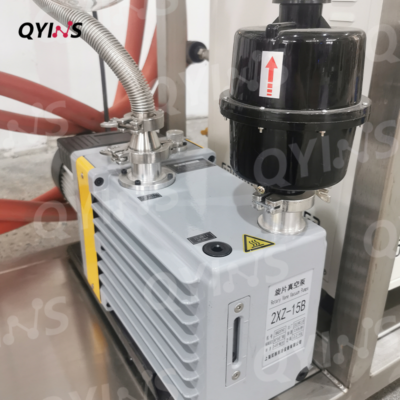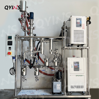 本款不銹鋼分子蒸餾,主材采用316不銹鋼,配備旋片式真空泵及擴散泵,極限空載真空度可達1Pa以內。在齒輪泵作用下,物料能夠實現自動進出,且進出管道全部采用夾套保溫設計,避免高熔點物料在反應過程中固化結晶。